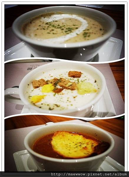 牛肝蕈濃湯、海鮮巧達湯、法式洋蔥湯