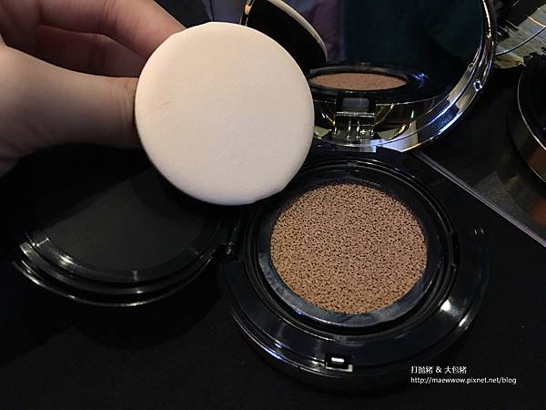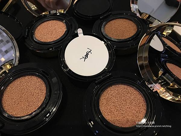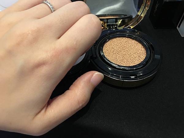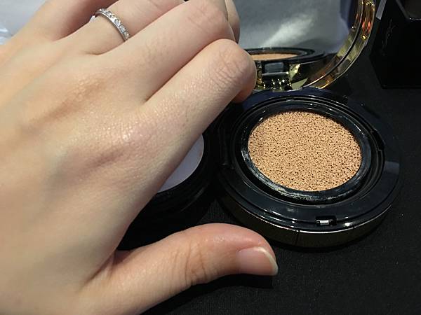 用YSL的恆久完美氣墊粉餅輕拍5下
