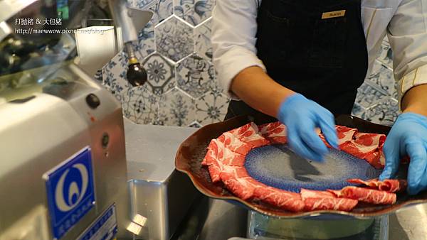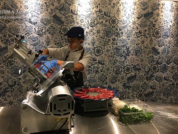 肉片就在整片青花瓷牆的工作台上現切片