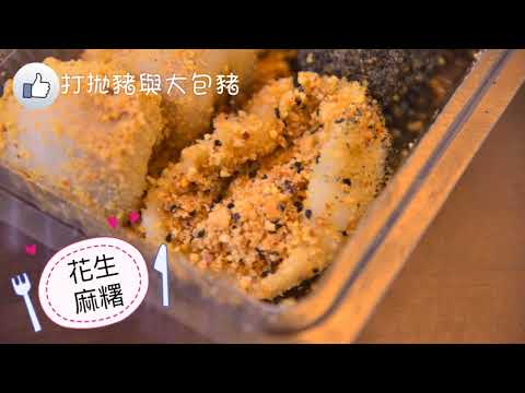 麻糬裡頭包上花生糖粉與芝麻糖粉後