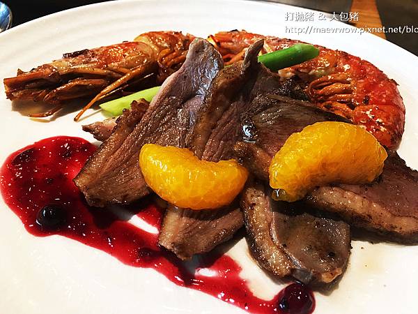 現煎鐵板區的天使紅蝦和鴨胸》
