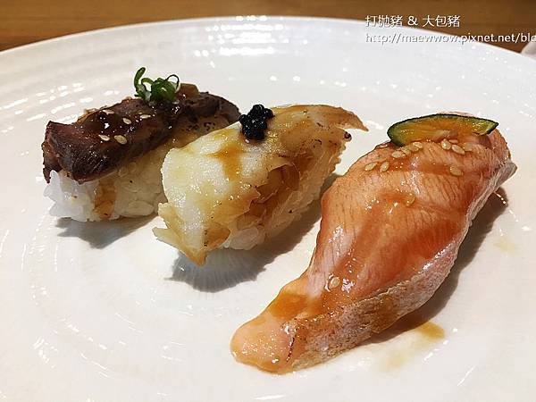 有炙燒鮭魚握壽司、小花枝握壽司和炙燒鰭邊肉握壽司三兄弟