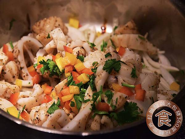 墨魚本身搭配紅椒黃椒再撒點香菜