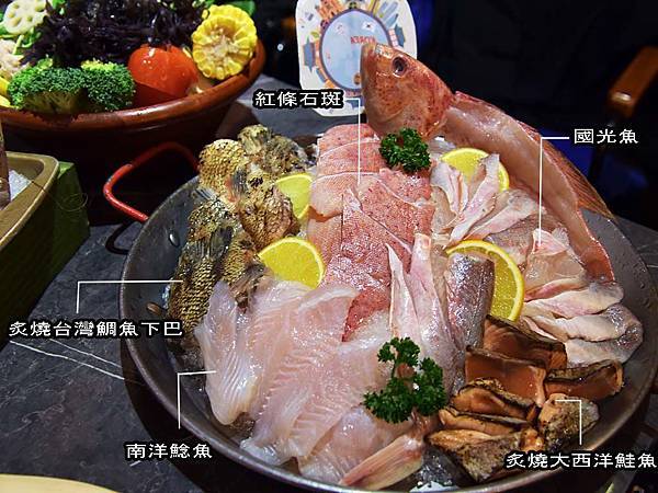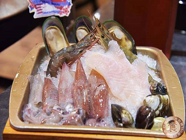 拼盤內有:野生劍蝦、北歐孔雀貝、南洋鯰魚、挪威北極甜蝦、東石蛤蠣、南海槍賊等海鮮