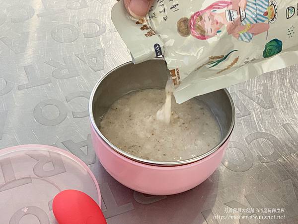 放入寶寶粥 熱水注入加熱10~15分鐘 就可以吃了