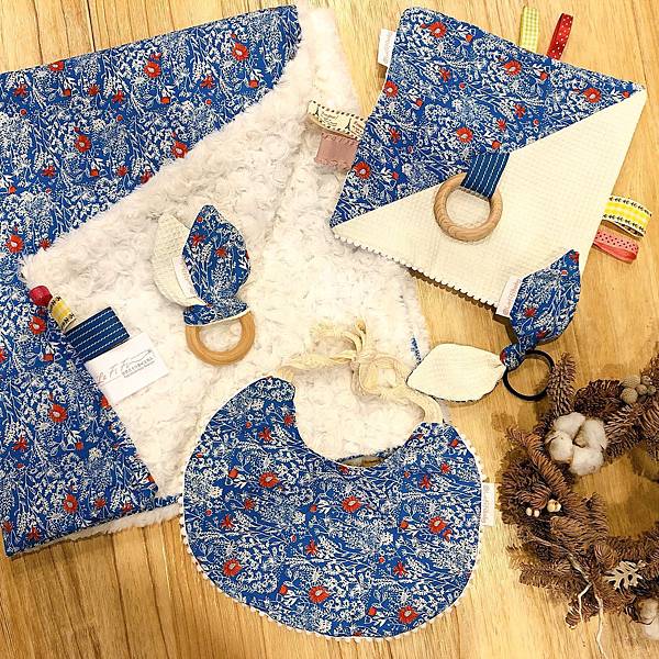 這款藍色花園玫瑰毯還有出一系列的彌月禮盒套組(包含玫瑰絨被、圍兜、安撫巾、造型原木顧齒器)