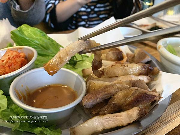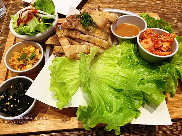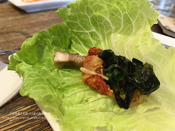 在生菜上放上剛烤好的厚切豬五花肉 、泡菜、海帶芽,再豪邁的一口咬下