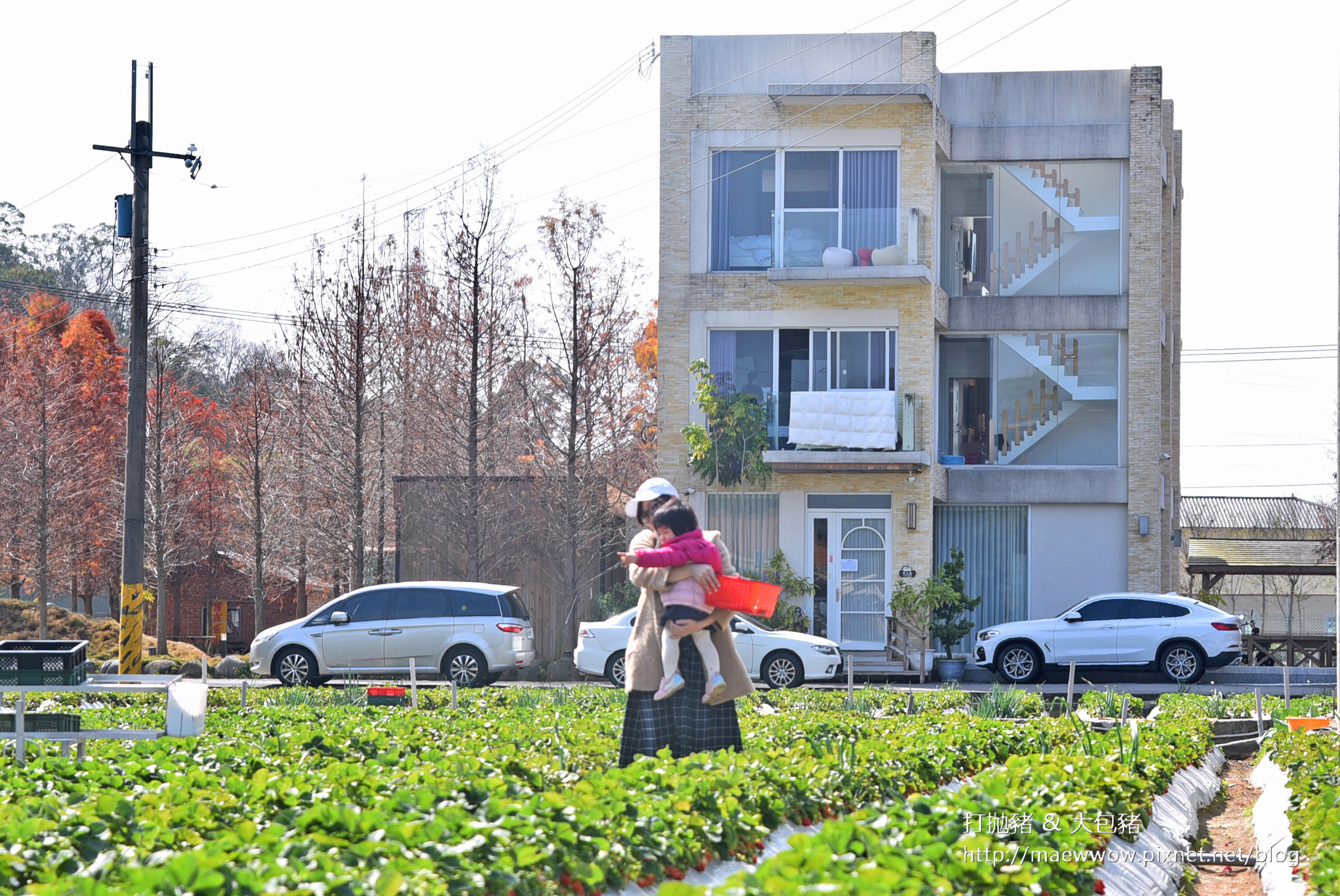 但大湖的草莓園實在是太多了,有高架的地架的,白的紅的草莓,就當我們行經一片又一片低矮的草莓園,還猶豫不決要選哪一間時,就被一塊有點突兀的小小落羽松森林吸引目光,疑?這不是我們今天的住宿地點-夏內爾落羽松民宿