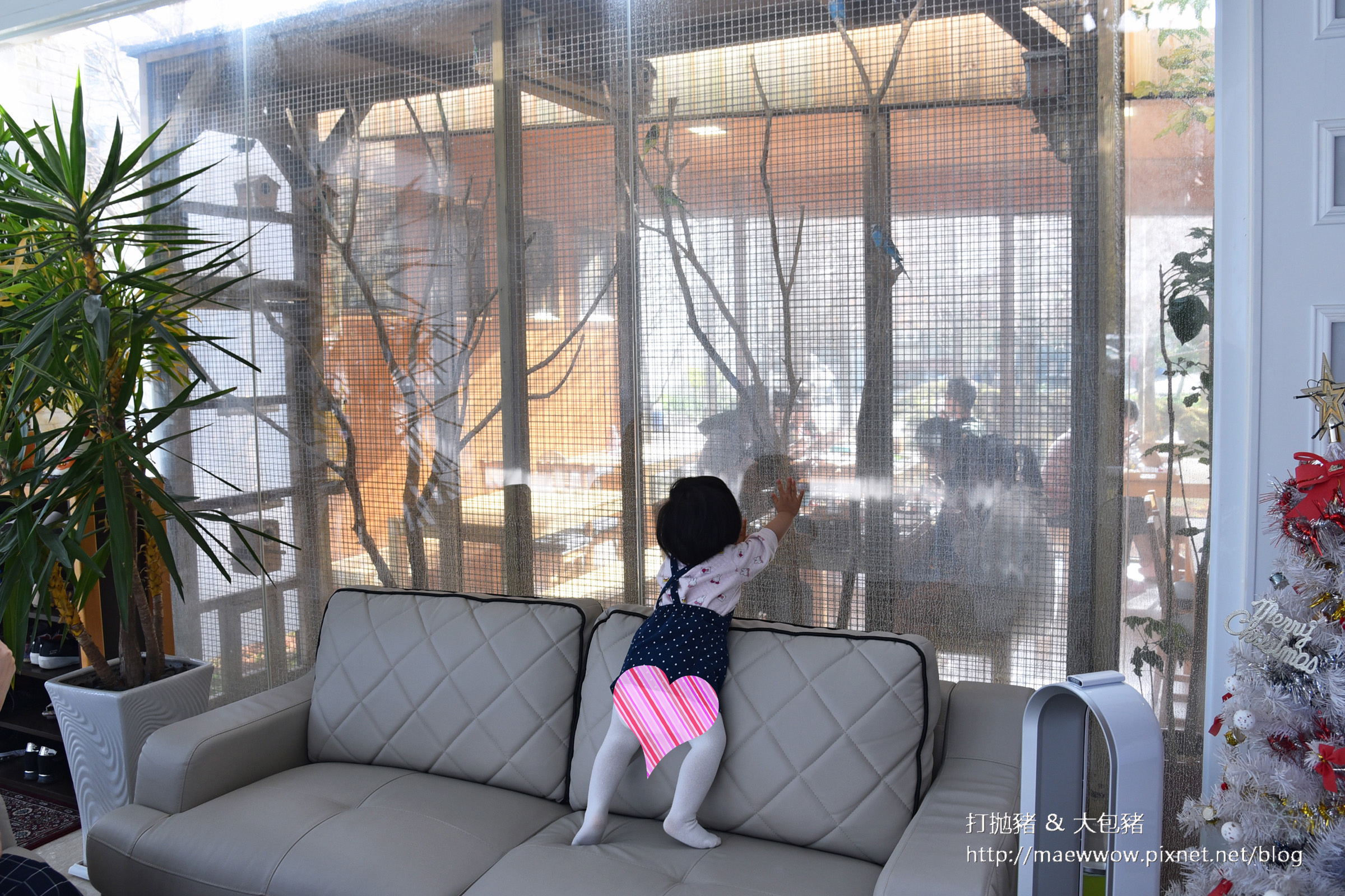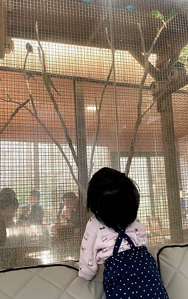 室內也打造了漂亮藍色和綠色鳥的鳥籠