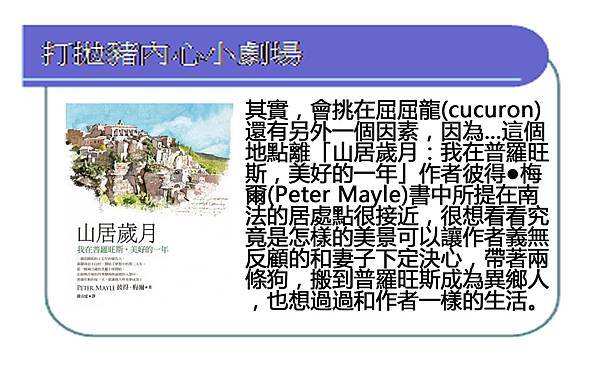 在山城的時光,打拋豬跟大包豬規劃了博尼約/奔牛村(bonnieux)、盧爾瑪蘭、昂蘇伊、阿普特、魯西隆、勾禾得、索格島、芳泉村以及比較遠的聖十字湖及瑪麗山城等大大小小共10個小鎮景點,因此住宿點就決定選在這些放射狀地點的中心附近。