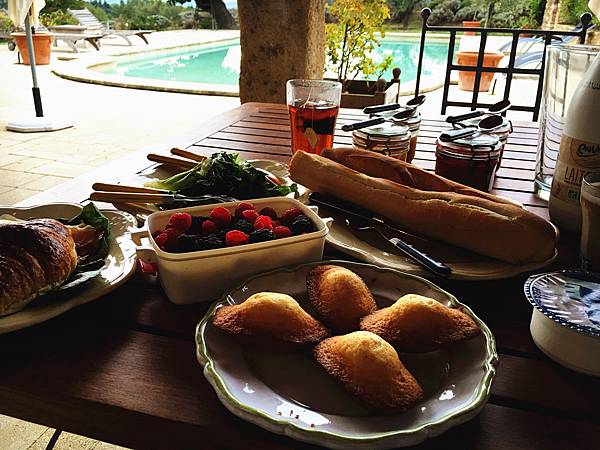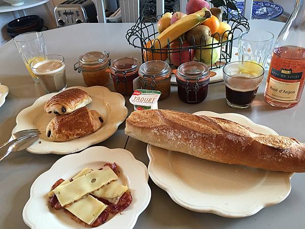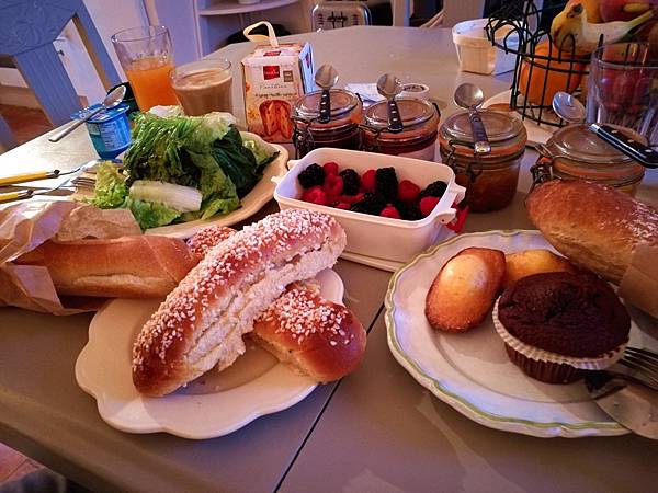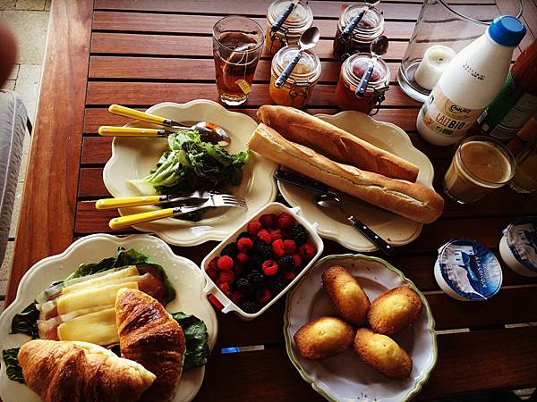 Chloe像養豬一樣,早餐多到吃不完,水果、可頌麵包、法國長棍麵包、綜合水果蛋糕、瑪德蓮蛋糕、起士、培根、牛奶、柳橙果汁、綜合果汁以及2種口味的「雀巢膠囊咖啡」...,還有必推的Chloe自製的超多種口味果醬,超好吃,每一口都可以吃到滿滿的果粒(光回想起來都會流口水),每天的早餐都不一樣,份量超足,吃不玩得我們就還帶出去當下午茶享用,早餐時光應該是大包豬最開心的時光